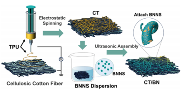 基于上述見解,研究者們提出了一種簡單的兩步制造工藝,以制造一種具有強散熱性的雙層織物,同時促進定向汗水輸送。具體來說,通過靜電紡絲在纖維素棉纖維(CCF)表面生長高彈性熱塑性聚氨酯(TPU),然后在纖維表面超聲波加載氮化硼納米片(BNNS),從而開發出可穿戴的janus型織物。CCF具有親水性,而TPU具有疏水性。這兩層之間的親水性差異建立了一個有效的定向汗液輸送系統。由于BNNS具有較高的固有熱導率,所制備的織物具有優異的傳熱性能。通過排汗蒸發和高散熱性能的綜合積極作用,有效調節表面溫度和濕度。