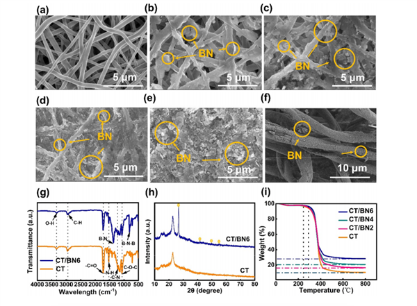 圖2 (a)原始TPU纖維和通過不同濃度BNNS獲得的纖維的SEM圖像:(b)2mg /mL, (c) 4mg /mL, (d) 6mg /mL, (e) 8mg /mL。(f) CCF表面的SEM圖像。(g) CT和CT/BN的FT-IR光譜和(h) XRD曲線。(i)不同濃度的BNNS得到的薄膜TGA曲線。