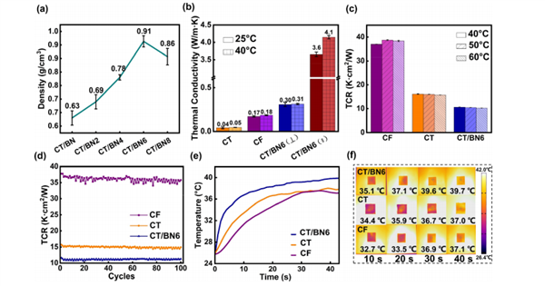 圖3 (a)不同BNNS含量的薄膜密度。(b) CT、CF、CT/BN6(平面交叉方向)、CT/BN6(平面內方向)的導熱系數。(c) CF、CT和CT/BN6在不同溫度下的TCR值。(d) CF、CT、CT/BN6 TCR循環試驗。(e) CF、CT、CT/BN6薄膜在加熱試驗中的溫度演變曲線。(f)加熱試驗中CT/BN6、CT、CF膜的紅外熱像圖。
