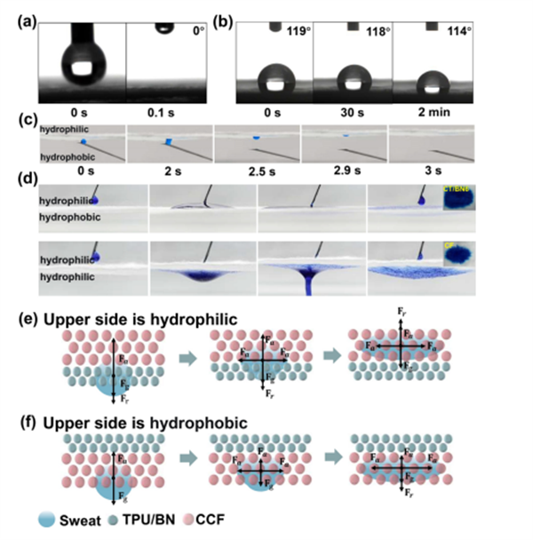 圖4 CT/BN6膜(a)親水性和(b)疏水性的接觸角測試。(c) CT/BN6膜的反重力液滴輸運試驗。(d) CT/BN6膜與CF膜中水輸運的不可逆性比較。CT/BN6膜(e)疏水性和(f)親水性的準靜態模型分析。