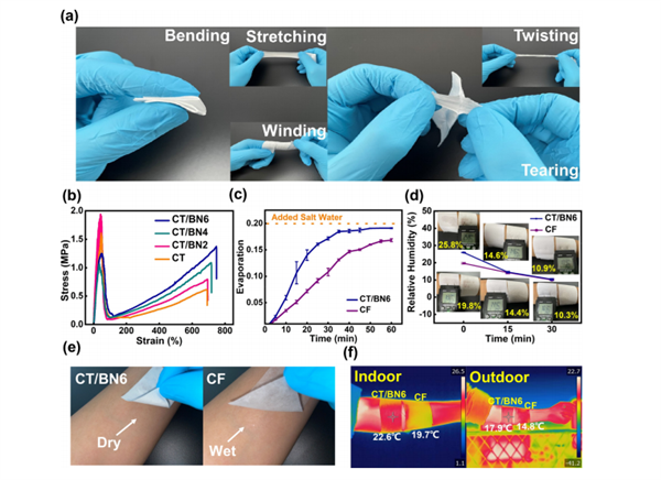 圖5 (a) CT/BN6的彎曲、拉伸、纏繞、扭轉、撕裂示意(b)不同BNNS含量薄膜的應力-應變曲線。(c) CF與CT/BN6的水分蒸發比較。(d) CT/BN6和CF在體表的水分蒸發試驗及相應記錄的濕度變化。(e)顯示排汗能力。(f)織物在室內外環境下的實際熱管理性能。