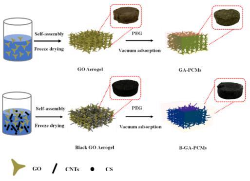 近日,上海先進(jìn)熱功能材料工程技術(shù)研究中心謝華清教授、于偉教授團(tuán)隊(duì)采用自組裝定向冷凍干燥制備了含有少量碳納米管(CNTs)和碳球(CSs)的黑色氧化石墨烯氣凝膠 (B-GA),以其為支撐材料,采用真空浸漬法得到了具有三維互穿網(wǎng)絡(luò)的聚乙二醇復(fù)合相變材料B-GA-PCM。結(jié)果表明,三維結(jié)構(gòu)和豐富的官能團(tuán)大大提高了復(fù)合相變材料的穩(wěn)定性,CNTs和CSs的加入大大提高了PCMs的導(dǎo)熱性和光熱轉(zhuǎn)換能力。與純PEG相比,熱導(dǎo)率提高了181.58%,光熱轉(zhuǎn)換效率可達(dá)89.3%。通過數(shù)值模擬也進(jìn)一步證實(shí),基于GA的相變復(fù)合材料表現(xiàn)出更好的導(dǎo)熱性。此外,三維相變復(fù)合材料還應(yīng)用于熱差發(fā)電,在移除光源后300 s內(nèi)仍可保持35 mV的穩(wěn)定輸出電壓。相關(guān)研究結(jié)果如下圖所示: