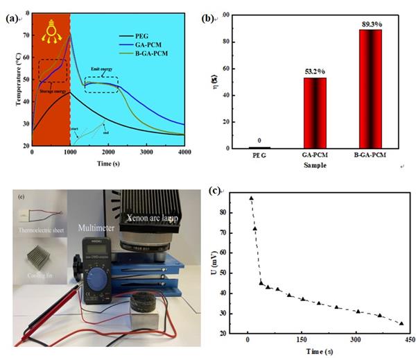 在模擬陽光下,B-GA-PCM的溫度升高很快,從25℃升高到50℃僅需200s。此外,連續(xù)光照1000s后,B-GA-PCM的溫度達(dá)到70℃,遠(yuǎn)高于PEG的相變溫度,而純PEG的溫度僅達(dá)到43℃,無法達(dá)到其熔點(diǎn)。經(jīng)計(jì)算,GA-PCM和B-GA-PCM的光熱轉(zhuǎn)換效率分別為53.2%和89.3%,證實(shí)了CSs和CNTs的引入大大提高了GA-PCM的光熱轉(zhuǎn)換效率。在太陽能-熱-電轉(zhuǎn)換測試中,當(dāng)相變復(fù)合材料吸收了大量的光能后,氙氣弧光燈關(guān)閉,萬用表上仍能檢測到一段時(shí)間的電壓,如圖3d所示。這一現(xiàn)象表明,相變復(fù)合材料有效地吸收了光能,并將其轉(zhuǎn)化為熱能,為熱差發(fā)電提供了可能性。
