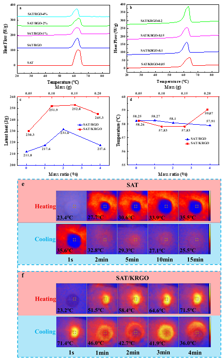 能源短缺和環境生態問題促使人們關注太陽能的有效利用。利用相變材料(PCM)儲能技術來解決能源矛盾,是目前提高能源利用率和保護環境的重要途徑。水合鹽具有儲能密度高和不易燃等優點,但存在過冷度大,且鹽易析出等突出的問題。本研究以石墨烯分散液為前驅體,通過水熱反應、冷凍干燥和改性過程構建具有超親水性能的三維石墨烯氣凝膠(KRGO),并通過物理浸漬熔融三水乙酸鈉得到了三維復合相變材料。通過改性,氣凝膠表現出優異的彈性和超親水性,三維有序排列多孔網絡和石墨烯保證了出色的光學吸收、高效的吸附能力和優異的光熱轉換效率。復合相變材料具有高的相變焓(252.8J/g),儲熱能力大于91%,不需添加額外的成核劑即可有效緩解過冷問題,過冷度可控制在0.2-1.5℃范圍,光熱轉換效率為86.3 %。該工作為水合鹽過冷問題緩解和高效的太陽能轉換-存儲利用提供了一種可行、經濟的策略。