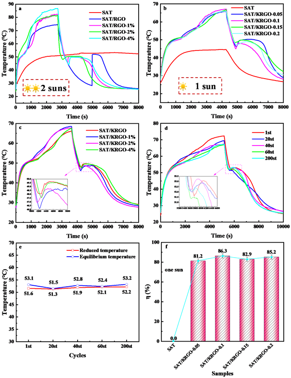 該研究成功制備了以親水改性的三維石墨烯氣凝膠支撐的復合相變材料。 KRGO氣凝膠表現出以下三個特點: (i)得到的KRGO氣凝膠具有優異的彈性和超親水性,為水合鹽提供豐富的成核位點;(ii) KRGO氣凝膠具有優異的吸附能力,保證了復合相變材料的高儲能密度;(iii)出色的光學吸收以及良好的PCM封裝。基于KRGO的優異特性,三維復合相變材料表現出優異的結構穩定性、高相變焓、熱可靠性和優異的光熱轉換,同時無需添加額外的成核劑即可一步式緩解水合鹽的過冷問題。該工作為三維復合相變材料的應用提供了一種新的設計思路,以實現高效的太陽能儲存和熱能利用。