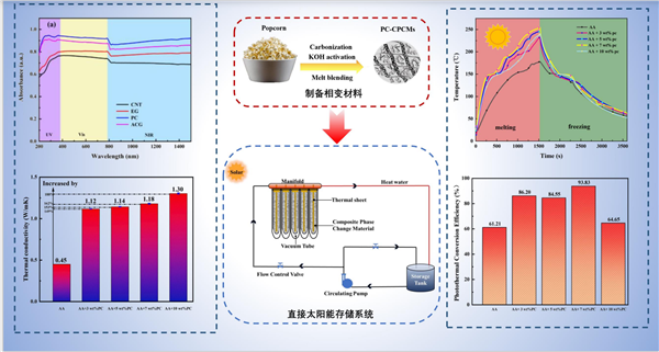 邵斐龍:作為典型的吸收式太陽能集熱器,直接吸收式太陽能集熱器在太陽能利用方面顯示出巨大的潛力。然而,由于太陽能的不穩定性和不連續性,熱源輸出難以持續。將DASCs系統與相變材料(pcm)儲能系統結合在一起的直接太陽能儲能系統是一種很有吸引力的儲能系統。在目前的工作中,以生物質多孔碳(PC)為太陽能吸收材料,以己二酸(AA)為pcm,在太陽能直接儲能系統中實現了太陽能收集、光熱轉換和長期儲能的一體化。AA+7wt%PC的光熱轉換效率高達93.83%。AA+7wt%PC的熱導率為1.18 W/(m·K),比純AA (0.45 W/(m?K))提高149%。pc - cpcm具有無過冷、儲能密度可達195.05 J/g的優點。環保型、廉價的生物質多孔碳基復合材料直接封裝太陽能儲能系統為太陽能的高效利用開辟了新的途徑。它能滿足不受天氣條件和時間影響的熱能需求。
