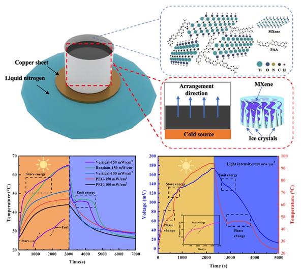 朱黎恒:傳統能源供需日益緊缺,太陽能作為一種清潔能源逐漸受到研究者的重視。將太陽能以熱能的形式直接儲存可以解決當前能源短缺問題,提高能源利用效率。二維金屬碳化物或氮化物(MXene)由于其多功能的表面化學、層狀結構和獨特的吸光度為其在光熱領域中受到廣泛關注。在本研究中,通過將MXene與聚酰亞胺相結合,采用定向冷凍方法構建具有垂直排列結構的氣凝膠,真空浸漬聚乙二醇獲得具有光-熱-電轉換的復合相變材料。相較于隨機排列結構,具有垂直排列的復合相變材料表現出更高的導熱性和光熱轉換,其熱導率達到1.61 W/(m·K),光熱轉換效率最高可達95.5%,具有31.6 W/m2的最大光-熱-電能轉換輸出功率。這項工作具有小體積、無污染等特性,在太陽能存儲和熱能利用具有廣闊的應用前景。