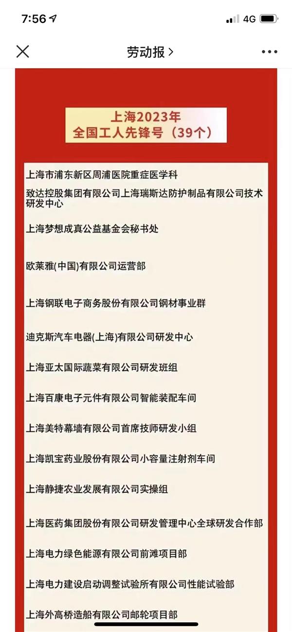 祝賀課題組合作伙伴瑞斯達技術研發中心團隊榮獲全國“工人先鋒號”表彰