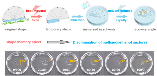 A biomass-derived and biocompatible poly(L-malic acid) (PMA) based material with shape memory effect (SME) was developed in this work. 1,8-octanediol was used as the cross-linker to construct crosslinking networks with hydrophilic backbone chain of PMA, tuning the density of networks and their swelling capacities by controlling -COOH/-OH ratios. The solvent-induced SME of as-obtained cross-linked PMAs was activated at mild conditions in this way. Using the shape recovery levels of U-shaped samples as the probes, the mixed methanol/ethanol/water systems with various ratios could be easily discriminated because the cross-linked PMAs show different sensing capacities to different components. The mechanisms were then studied in terms of the solvent molecule-polymer interactions. This work provides an interesting approach of visible discrimination of the solvents with similar structures, or their mixtures with various ratios, and also opens applications of biocompatible shape memory polymers in biomedical and chemical industries.
