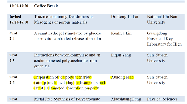 第二屆高分子化學國際研討會(ICPC 2018)于2018年7月14-16日在昆明舉行。本屆大會國內外高分子化學領域內的學者專家前來參會,并做出精彩的報告。毛旭宏研究生作了題為“Preparation of tea polysaccharide nano-particles with high efficacy of small intestinal targeted absorption property”的Oral交流報告。