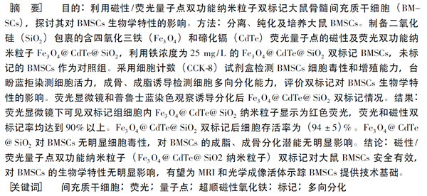 [241] 顏榮華, 王勁, 單鴻*, 聶立波, 張黎明.磁性/熒光量子點雙功能納米粒子雙標記對大鼠骨髓間充質干細胞生物學特性的影響 [Biological