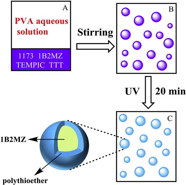 A novel method was developed to encapsulate 1-benzyl-2-methylimidazole (1B2MZ) to produce microcapsule-type latent curing agent using thiol-click reaction in an oil/water emulsion. The fabrication process was significantly simplified and required reaction time was greatly shortened due to the efficiency of click chemistry. In the oil phase, 1B2MZ was mixed with reactive monomers, 1,3,5-tri-2-propenyl-1,3,5-triazine-2,4,6 (1H, 3H, 5H)-trione (TTT) and tris[2-(3-mercaptopropionyloxy)ethyl] isocyanurate (TEMPIC) which would polymerize to result in polythioether shell of microcapsules by following a photoinitiated thiol-ene mechanism. Polyvinyl alcohol (PVA) aqueous solution acted as water phase. The whole reaction process lasted for 20 min, which was enough for almost full conversions of monomers. The generated latent curing agent had good spherical shapes with smooth outer surfaces and the mean diameter distributed in the range of 105.7 to 18.17 μm by adjusting PVA concentration or viscosity of oil phase. The curing behavior, kinetics and releasing mechanism of latent curing agent were studied by differential scanning calorimetry (DSC) and scanning electron microscope (SEM). This microcapsule-type latent curing agent had a long storage life for 30 days when mixed with epoxy resin at 20 °C, and the mixture could be cured at 100 °C within 1 h.