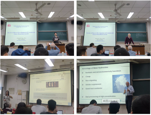 講壇分為上午和下午兩場,上午主要由Dr. Kelvin K. Shen、Prof. Ga?lle Fontaine、Prof. Manfred D?ring分別來為大家講述他們所做的科研內容。首先由火安全研究中心的張勝教授和谷曉昱教授對各位教授的到來表示衷心的歡迎,并對他們做了簡要的介紹。Dr. Kelvin K. Shen向我們報告了題為”Review of Recent Development of Commercial Flame Retardants in E/E”的內容;Prof. Ga?lle Fontaine向我們介紹了題為”Ageing of Fire Retarded Polylactic Acid”的內容;Prof. Manfred D?ring 向我們報告了”Phospha-Michael Adducts as Flame Retardants in Epoxy Resins”的內容;三位教授分別從阻燃劑的種類、PLA的老化問題、環氧樹脂中應用的阻燃劑這三個方面讓大家進一步了解阻燃的應用領域,在報告結束時,大家積極將自己心中的疑問向教授們提問,教授細心的為每一位同學答疑解惑,每個人都收獲到了許多知識。