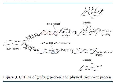 Chemical grafting and pad-dry physical treatment with maleic anhydride (MA) and 2-hydroxyethyl methacrylate (HEMA) were employed to improve the fire resistance of polyamide 66 (PA 66) fabric, respectively. The flammability characterization demonstrated that chemical grafting could improve the antidripping property of the fabric by the elimination of the melting process which resulted from the so-called scaffolding effect during combustion. Pad-dry physical treatment improved the fire performance (including antidripping tendency) of PA 66 fabric through notable molten contraction which could keep the fabric away from the igniting source. It has been suggested that the premature decomposition of the monomers/graft chains can remove the heat from the fiber and delay the further decomposition of the substrate. The chemical grafting significantly improved the hydrophilicity of the samples, while the physical treatment decreased the hydrophilicity of PA 66 samples.