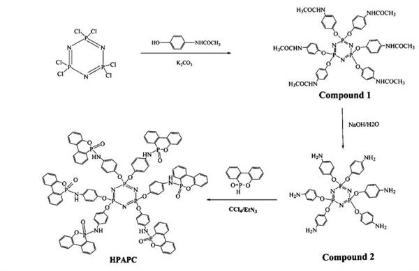 The novel phosphortis/nitrogen=zontainirig flame retardant hexa(phosphaphenarithrene aminophenoxyl)-cyclotriphosphatene (HPAPC), which contains Phosphaphenanthrene [9,10-dihydro-oxa-10,phosphaphenanthrene 10-oxide (DOPO)] and phosphazene (hekachlorocyclotriphosphazene) groups; was synthesized by the classic Atherton-Todd reaction, and its chemical structure was characterized by Fourier transform infrared (FTIR) and nuclear magnetic resonance (NMR) spectroscopies. Poly(lactic acid) (PLA) composites containing HPAPC were prepared by melt blending, and their fire performance and thermal behaviors were investigated in terms of limiting oxygen index (LOT); vertical burning (UL-94), dine calorimeter tests, and thermogravimetric analysis :(TGA). The LOT value could reach up to 347%, and UL 94 Could pass V-0 for the KA composite containing only 5 wt HPAPC, TGA results showed that the char formation of PIA could be significantly improved by the presence of HPAPC. The evolved gas of the Composite was analyzed by FTIR-TGA and pyrolysis gas chromatography/mass spectrometry (Py GC/IVIS). The dispersion of fillers in PLA was observed by:back-scattered electron (BSE). The Chat morphology was Characterized by FTIR Spectroscopy and scanning electronic microscopy (SEM). It was suggested that the ''''presence of HPAPC could release ammonia gas during combustion, which was beneficial to the formation of an intumescent Char structure.
