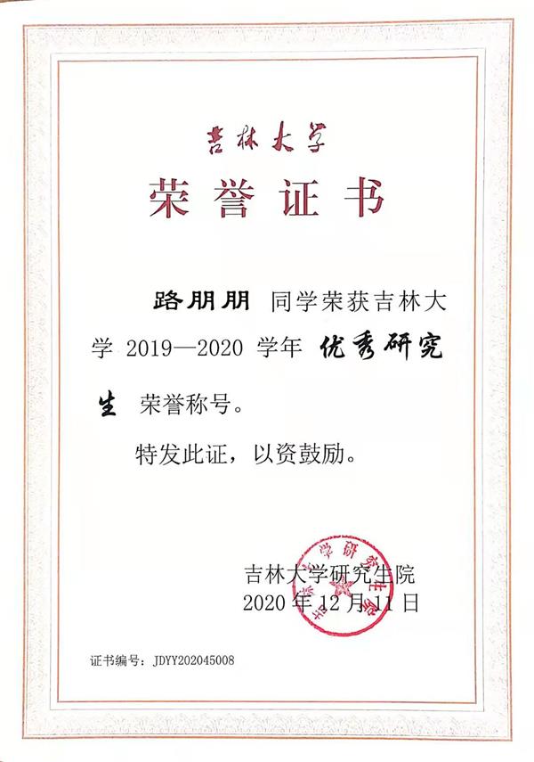 路朋朋同學榮獲吉林大學2019-2020年優秀研究生榮譽稱號,2020年12月11日,頒發機構:吉林大學研究生院