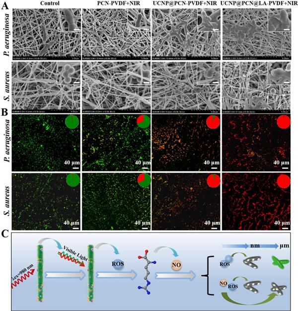圖 6. (A) 附著在不同膜上的銅綠假單胞菌和金黃色葡萄球菌的 SEM 圖像,經過/不經過 NIR 處理(插圖比例尺為 500 nm)。 (B) 附著在不同膜處理的 PET 薄膜上的銅綠假單胞菌和金黃色葡萄球菌的 CLSM 圖像。 (C) NO輔助PDT抗菌策略的說明機制。