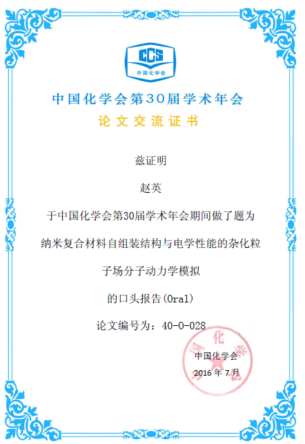 2016年7月趙英副教授參加中國化學會第30屆學術年會并做口頭報告