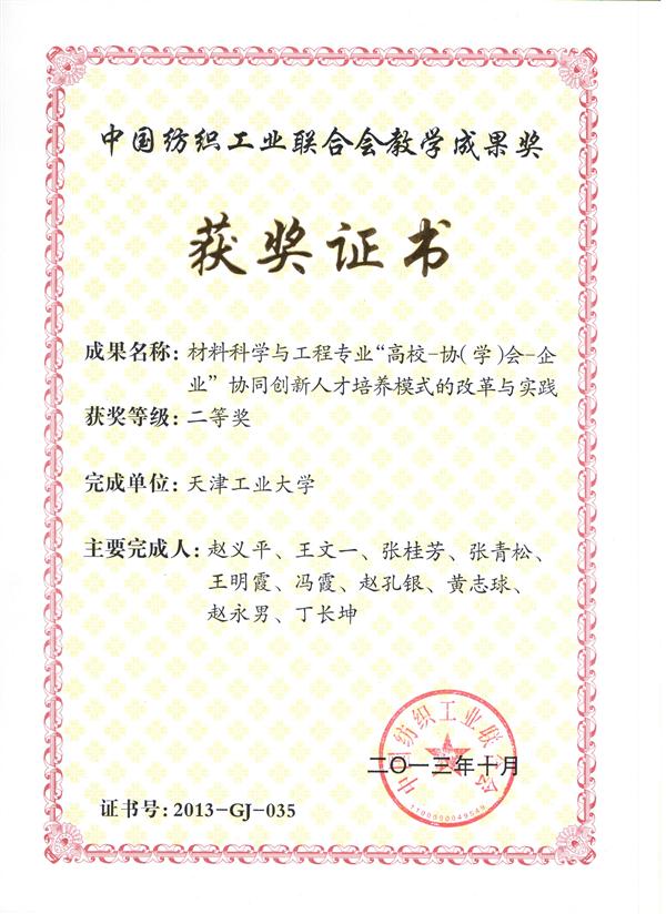 2013年獲中國紡織工業(yè)聯(lián)合會(huì)紡織教育教學(xué)成果獎(jiǎng)二等獎(jiǎng)
