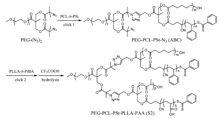 The synthesis and properties of a star quintopolymer comprising poly(ethylene glycol) (PEG, A), poly(ε-caprolactone) (PCL, B), polystyrene (PSt, C), poly(L-lactide) (PLLA, D), and poly(acrylic acid) (PAA, E) segments were described. Terminal diazide functionalized PEG (PEG-(N3)2), alkyne-mid-functionalized PCL-b-PSt and PLLA-b-PtBA diblock copolymers acted as building blocks to synthesize the target ABCDE star via modular synthesis. DSC analyses revealed that star copolymers usually exhibited complex chain relaxation and melting behaviors although arm segments were partly compatible. Various copolymers could self-assemble into vesicles (for ABC and ABCDE stars) and micelles (for the DE copolymer) in aqueous solution, and the release rate of doxorubicin from various aggregates at pH 7.4 decreased in the order DE > ABCDE star > ABC star. For the same types of aggregates, the increment in the cumulative amount at pH 5.3 for 72 h was 66.9% (for ABCDE vesicles) and 92.5% (for DE micelles), higher than that at pH 7.4 in the same period, revealing the remarkably accelerated release kinetics under acidic conditions. The ABCDE vesicles had great potential as controlled delivery vehicles due to their excellent stability, satisfactory drug loading efficiency, and pH-responsive drug release properties.