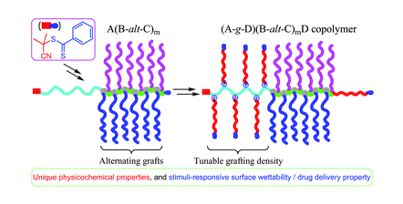 The synthesis and properties of novel (A-g-D)(B-alt-C)mD-type heterografted toothbrush-like copolymers are described. The target copolymers comprised three types of building blocks, involving a terminal comb-like block with a quaternization bridging poly(N,N-dimethylaminoethyl methacrylate) (PDMA, A) substrate and D grafts, a middle comb-like block with a poly(styrene-alt-maleimide) backbone and alternating PEG (B) and PCL (C) grafts, and a terminal D segment involving poly(N-isopropylacrylamide) (PNIPAM), poly(methyl methacrylate) (PMMA), polystyrene (PSt) and poly(methyl acrylate) (PMA). The combination of quaternization and RAFT processes allowed for the controlled synthesis of the target copolymers with a precise microstructure and tunable composition and grafting density. With the changes in macromolecular architecture, chemical composition and grafting density, toothbrush-like copolymers were liable to exhibit different physicochemical properties such as chain relaxation, melting, crystallization and self-assembly behavior. The introduction of chemical heterogeneity into non-responsive toothbrush-like copolymers could endow polymer films with notable thermo-dependent wettability due to accelerated surface penetration and reconstruction. Meanwhile, the drug release properties of PNIPAM-based aggregates were significantly affected by temperature, additives and end groups, revealing their potential as promising controlled delivery vehicles. In addition to developing a general approach towards the construction of sequence-defined toothbrush-like copolymers with multicomponent grafts and variable grafting densities, our study further extended their potential applications in stimuli-sensitive surfaces and biomedical materials via changing the compatibility and supramolecular interactions.