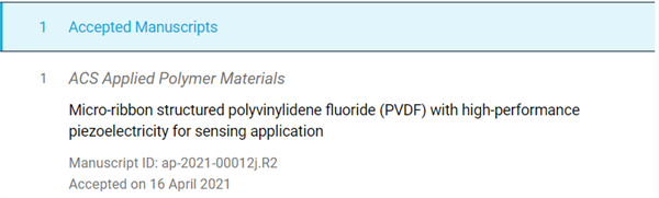 祝賀碩士生朱鏡瞻關(guān)于具有高壓電性能的微帶結(jié)構(gòu)PVDF用于傳感的論文被《ACS Applied Polymer Materials》接收