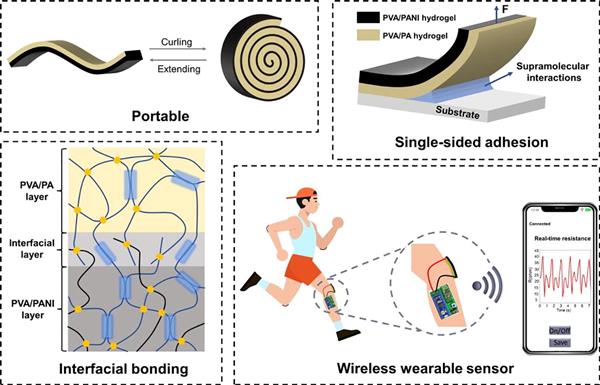 課題組于近日報道了一種單面粘附水凝膠傳感器,單面粘附水凝膠為層狀結構,粘附層由聚乙烯醇和植酸組成,非粘附層由聚乙烯醇和聚苯胺組成。研究結果于2022年5月26日在Chemical Engineering Journal在線發表。研究工作由陜西科技大學劉漢斌老師課題組和西安工業大學周宏偉老師課題組合作完成。課題組碩士研究生王明城為本文的第一作者。該工作主要研究內容包括: