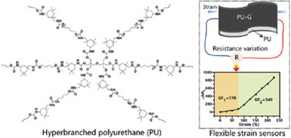 課題組于近日報道了以雙季戊四醇,異佛爾酮二異氰酸酯和聚四氫呋喃為原料制備聚氨酯彈性體的方法。進一步在彈性體表面構筑聚氨酯-石墨烯層制備了導電復合材料,探索了復合材料在柔性應變傳感器中的應用。研究結果于2022年5月4日在Macromolecular Materials and Engineering在線發表。課題組碩士研究生魏傳娟為本論文的第一作者。