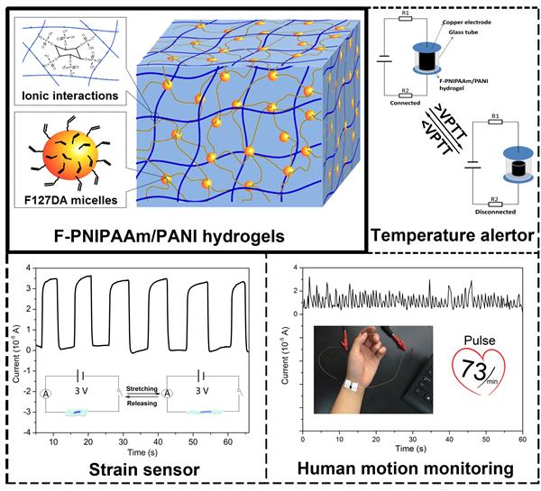 The first example of dually synergetic network hydrogel, which has integrated mechanical stretchability, thermal responsiveness and electrical conductivity, has been constructed by a versatile and topological co-crosslinking approach. Poly(N-isopropylacrylamide) (PNIPAAm) is introduced as the thermally responsive ingredient and polyaniline (PANI) is selected as the electrically conductive ingredient. PNIPAAm network is crosslinked by double bond end-capped Pluronic F127 (F127DA). PANI network is doped and crosslinked by phytic acid. These two ingredients are further mechanically interlocked. Due to the integrated multiple functionalities, the topologically co-crosslinked hydrogels, as will be mentioned as F-PNIPAAm/PANI hydrogels, can be fabricated into resistive-type strain sensors. The strain sensors can achieve a gauge factor of 3.92, response time of 0.4 s, and sensing stability at least for 350 cycles and can be further applied in monitoring human motions, including motion of two hands, bending of joints, even swallowing and pulse rate. Moreover, F-PNIPAAm/PANI hydrogels are utilized to construct efficient temperature alertors based on the disconnection of circuits induced by the volume shrinkage at high temperature.
