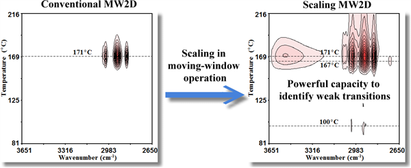 5) 廣義縮放移動窗口二維相關光譜模塊(scaling): 同時適用于mw2d和普通廣義二維相關光譜,特別是scaling-mw2d譜圖對于探測弱轉變特別有效;