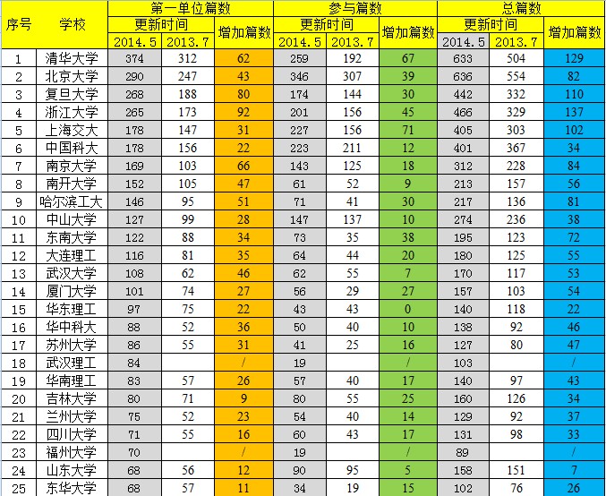 ESI十年高引論文國內大學排名(2014年5月和2013年7月對比)