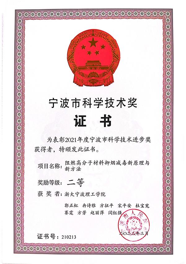 “阻燃高分子材料抑煙減毒新原理與新方法”獲寧波市科學技術二等獎