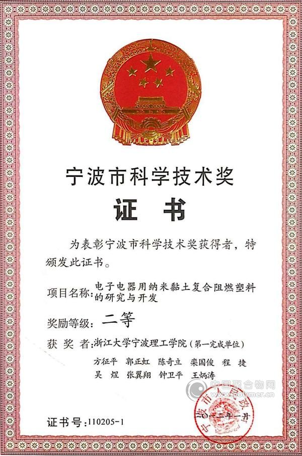 本成果在項目組長期的基礎研究成果指導下,采用納米黏土與膨脹型阻燃劑復合阻燃塑料,克服了含鹵阻燃劑燃燒時發煙量大、有害腐蝕性氣體產生量多、對環境影響大的缺點,開發了一系列電子電器用納米黏土復合阻燃塑料,已建成多條生產線,年產2000噸以上。獲授權國家發明專利2項,發表SCI論文27篇。